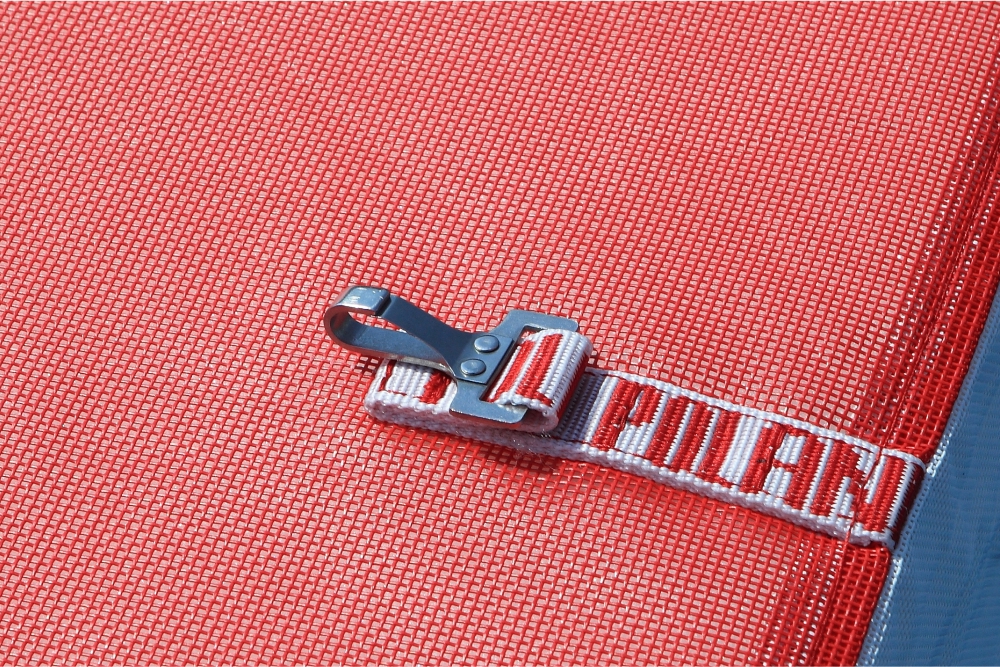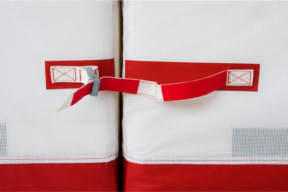 Cada segmento do colchão está equipado com alças em fita jacquard de alta resistência, firmemente fixadas com costura reforçada para facilitar o manuseamento e a montagem. A almofada superior é fixada à área de aterrissagem através de ganchos em aço inoxidável e argolas em D, garantindo estabilidade e segurança durante a utilização. Os diferentes segmentos são unidos por cintas de fita jacquard com fivelas metálicas autotravantes, reforçadas com costuras resistentes que asseguram uma ligação extremamente durável.